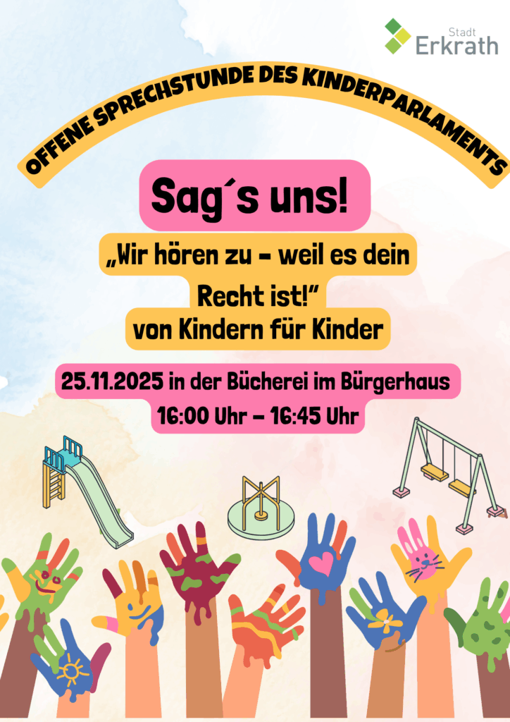 Hier können alle Kinder vorbeikommen, ihre Ideen oder Wünsche sagen und erzählen, was sie in Erkrath gerne anders hätten. Wir hören zu und bringen die Ideen dann ins Kinderparlament.